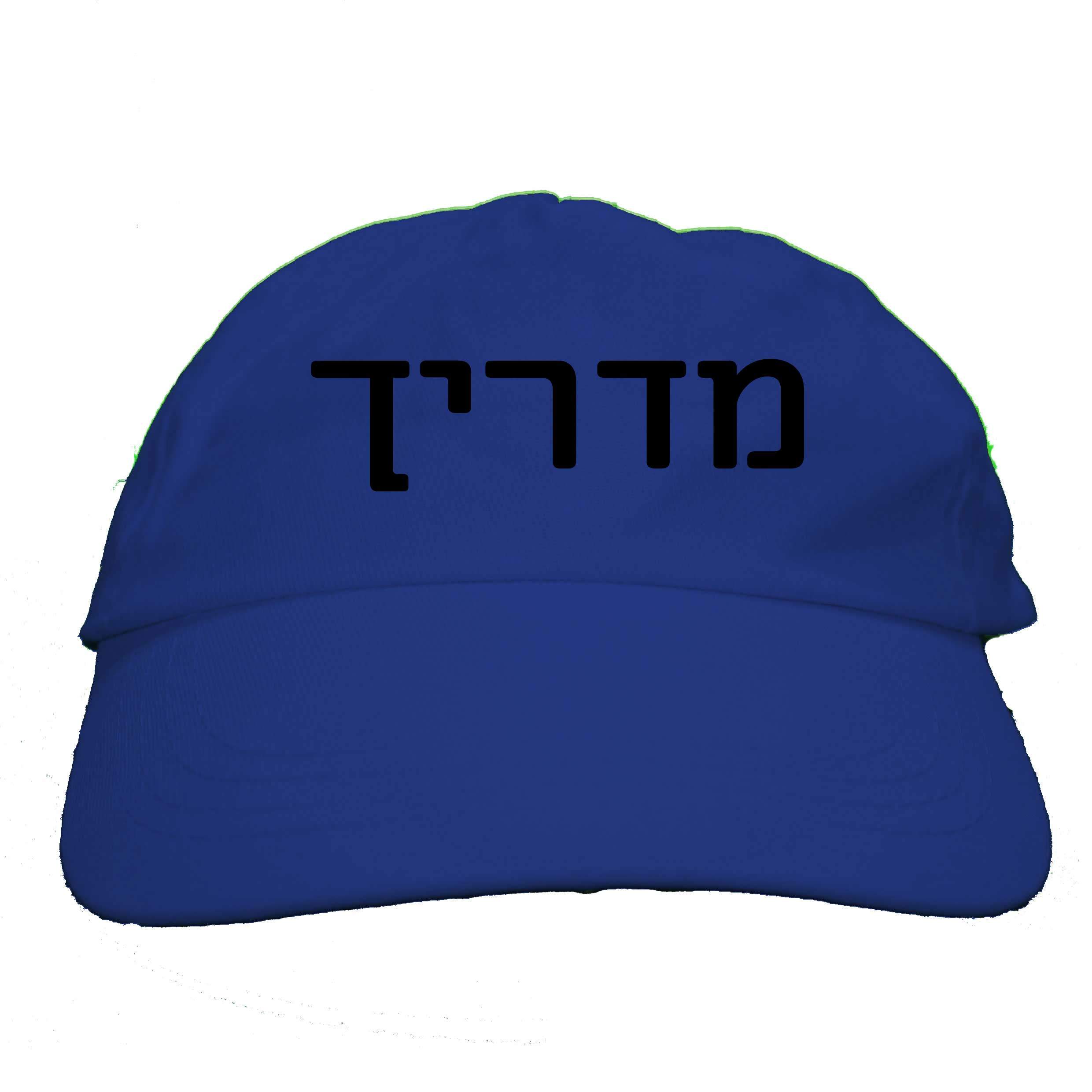 הדפסה על כובע מצחייה את הכיתוב מדריך או מדריכה הכובע עשוי ממאה אחוז כותנה. בצבעים כחול אדום שחור ירוק לבן וכחול.